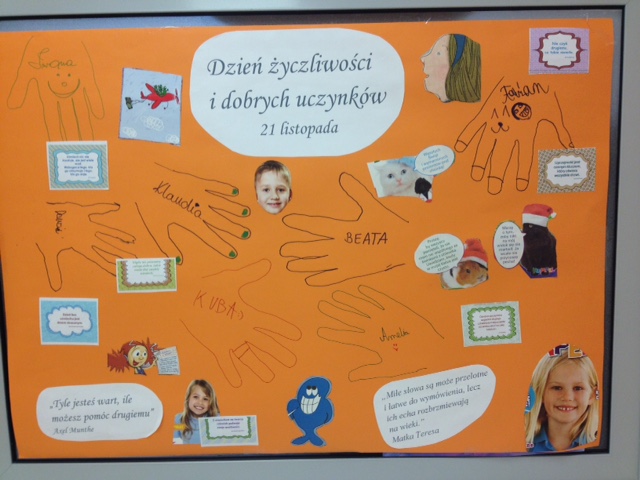 21. listopada nasi uczniowie obejrzeli prezentację z pięknymi wierszami oraz piosenkami o życzliwości i potrzebie spełniania dobrych uczynków. Wykonali wspólnie kolorową pracę, komponując ją z obrazków i cytatów, które najbardziej im się spodobały.