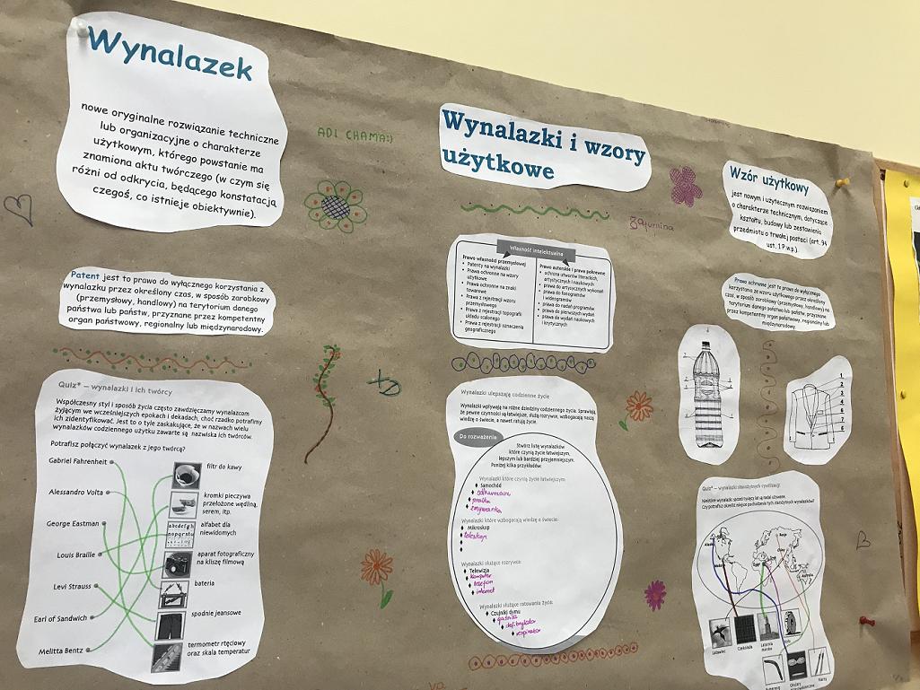 Na lekcji fizyki jedna z naszych nauczycielek realizowała ciekawy temat o wynalazkach i wzorach użytkowych. Podczas spotkania uczniowie rozwiązywali quizy o wynalazkach oraz wykonali plakat.