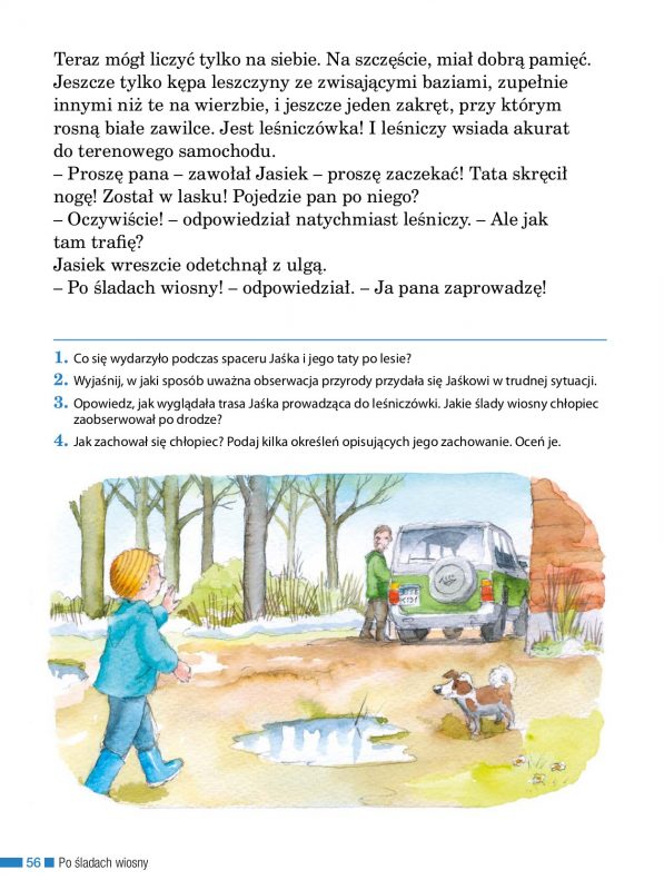 Spróbuj odpowiedzieć na pytania zapisane pod opowiadaniem. Czy pamiętasz jakie ślady wiosny pomogły trafić Jasiowi do pana leśniczego? Zapisz je w zeszycie.