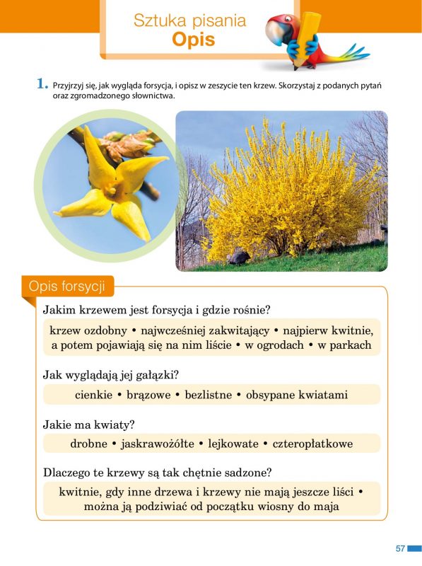 Forsycja jest ………… ( i tu wybierasz z pośród podanych informacji) możesz np zapisać: najwcześniej zakwitającym krzewem ozdobnym, rosnącym w parkach. Albo: Forsycja jest krzewem, który najpierw kwitnie, a potem pojawiają się na nim liście.