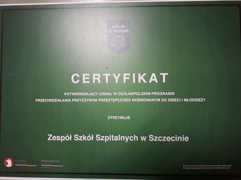 21 października nasi uczniowie wzięli udział w zajęciach z cyklu „Lekcje z Temidą”, czyli w ogólnopolskim programie przeciwdziałania przestępczości skierowanym do dzieci i młodzieży. Otrzymaliśmy już certyfikat potwierdzający nasz udział i z niecierpliwością czekamy na kolejną edycję, oczywiście deklarując nasz udział.