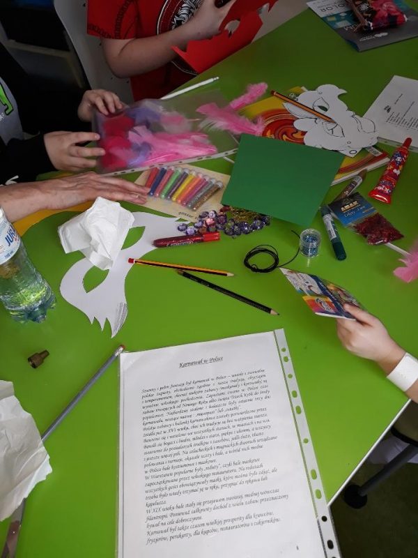 Najpierw uczniowie czytali i słuchali ciekawostek dotyczących karnawału, a potem przygotowali oryginalne maski według własnego pomysłu. Na koniec jeszcze młodzież odpowiadała na pytania quizu dotyczącego zwyczajów karnawałowych.