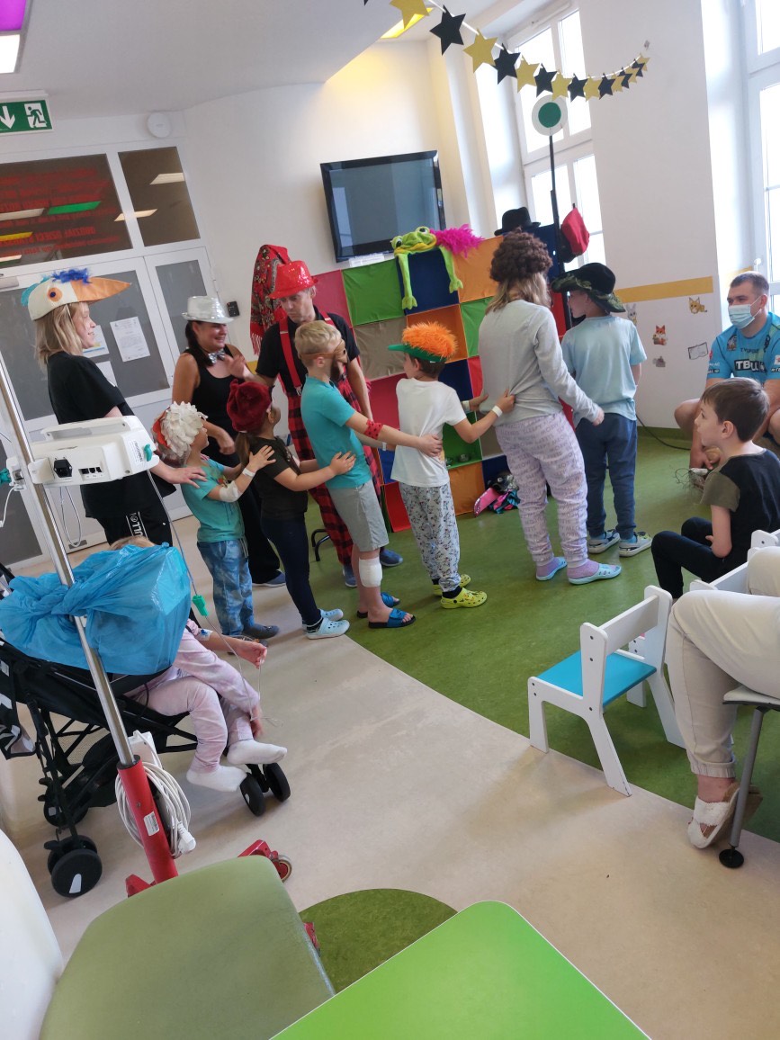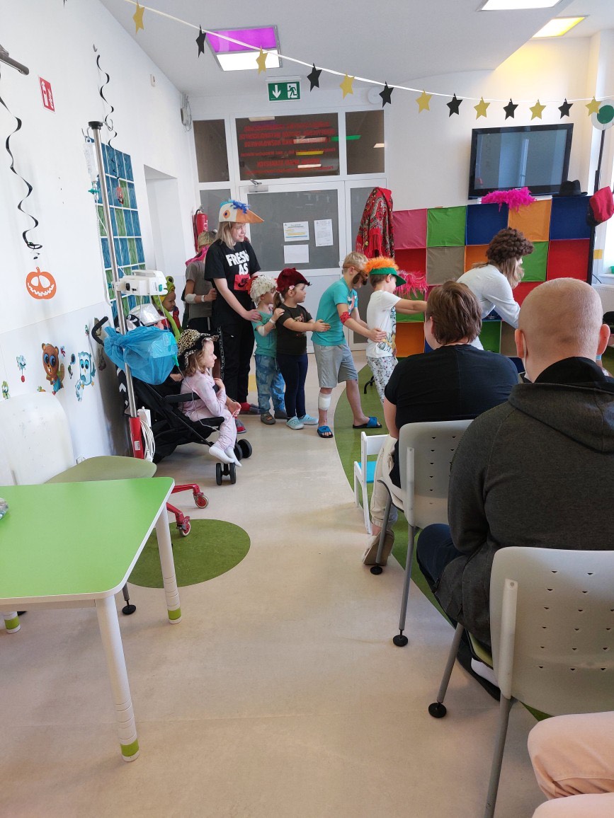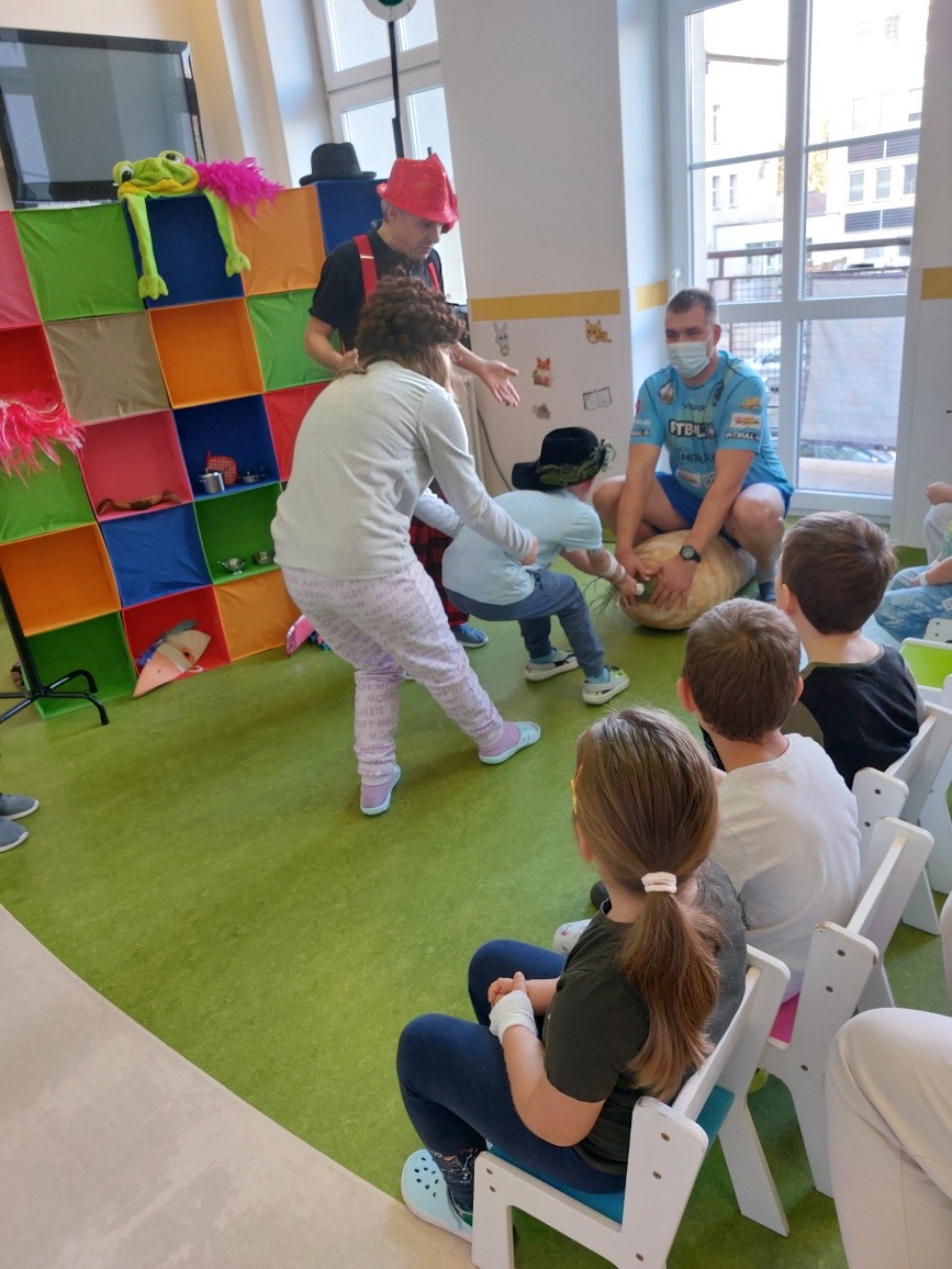 27 października w szpitalu przy ul. Unii Lubelskiej gościliśmy Teatr Rozmaitości „Gwitajcie” z przedstawieniem zatytułowanym „JuliJan Dzieciom”. Było to fantastyczne połączenie tego co najlepsze, w twórczości dla dzieci, Juliana Tuwima i Jana Brzechwy. Spektakl przyjął formę mocno interakcyjną i był to wielki atut tego spotkania, z niesamowitymi aktorami, którzy zachwycili obecnych już od pierwszych minut spektaklu! Pacjenci z kilku oddziałów szpitalnych zebrani na korytarzu pediatrii, ochoczo śpiewali , „wyciągali rzepkę”, i tworzyli lokomotywę. Były nawet takie momenty, że widownia dziecięca świeciła pustkami, a na krzesełkach siedzieli tylko… rodzice. Na koniec każdy mógł poczęstować się cukierkami.