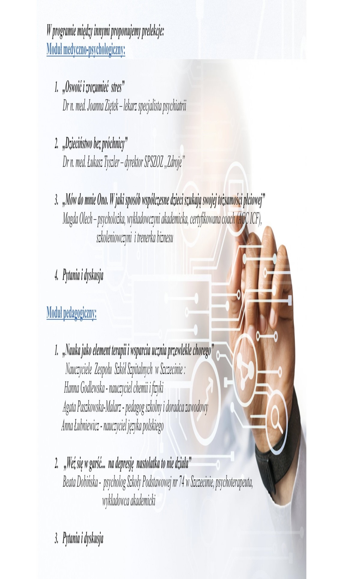 W dniu 17.11.2022r. Hanna Godlewska, Agata Paszkowska-Malarz oraz Ania Łubniewicz, wspierane przez panią Dyrektor – Justynę Krakowiak-Misiunę, wystąpiły w roli prelegentów na konferencji „Oświata – Medycyna bliżej dziecka” im. Marioli Budziach, która odbyła się w tym roku pod hasłem „W trosce o zdrowie psychiczne” w Szkoła Podstawowa nr 74 w Szczecinie .