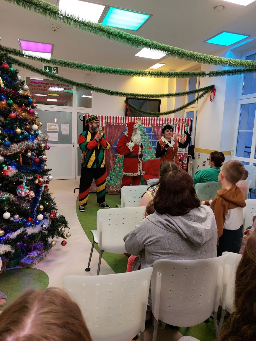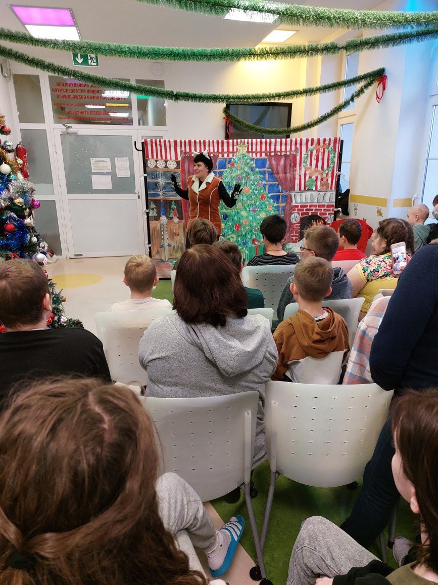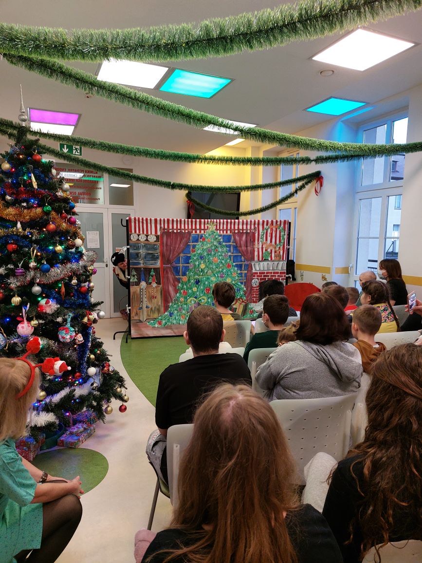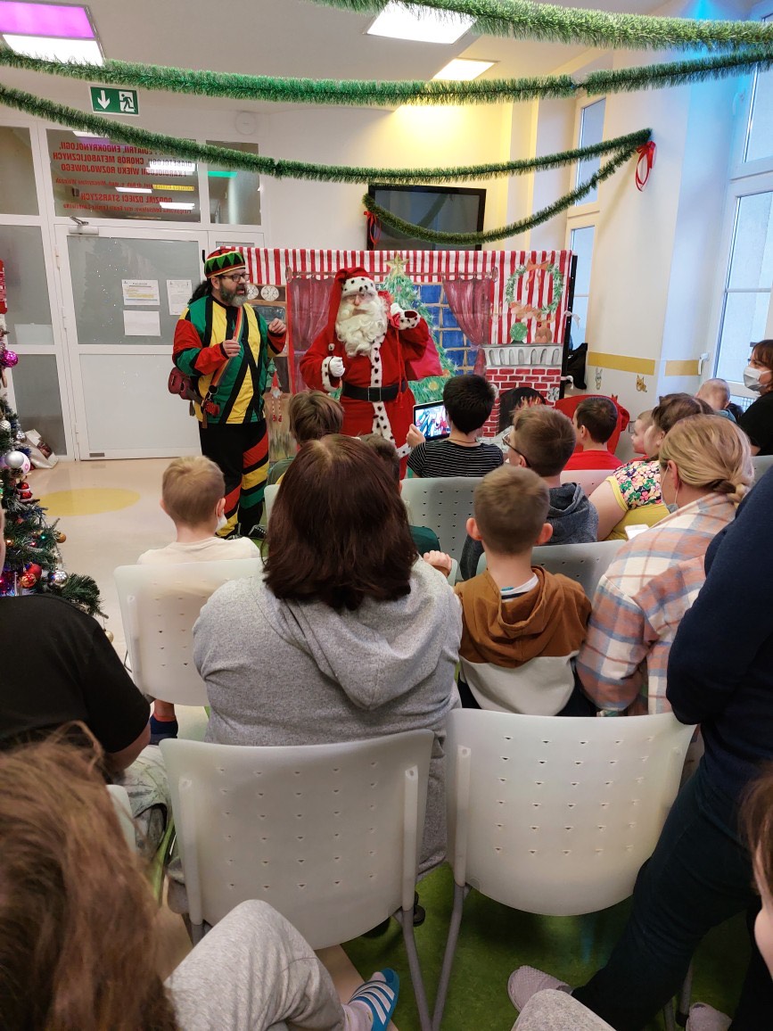 Po południu gościliśmy Teatr Rozmaitości „Gwitajcie” ze świątecznym przedstawieniem, po zakończeniu którego nasz gość specjalny- Święty Mikołaj – rozdawał paczki.