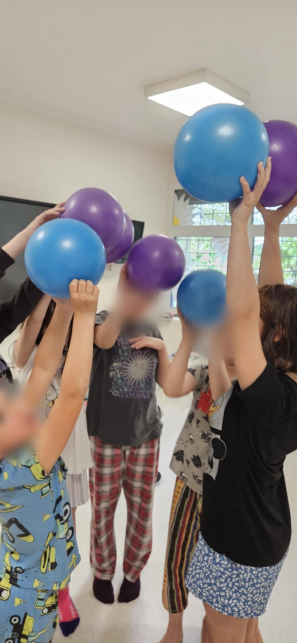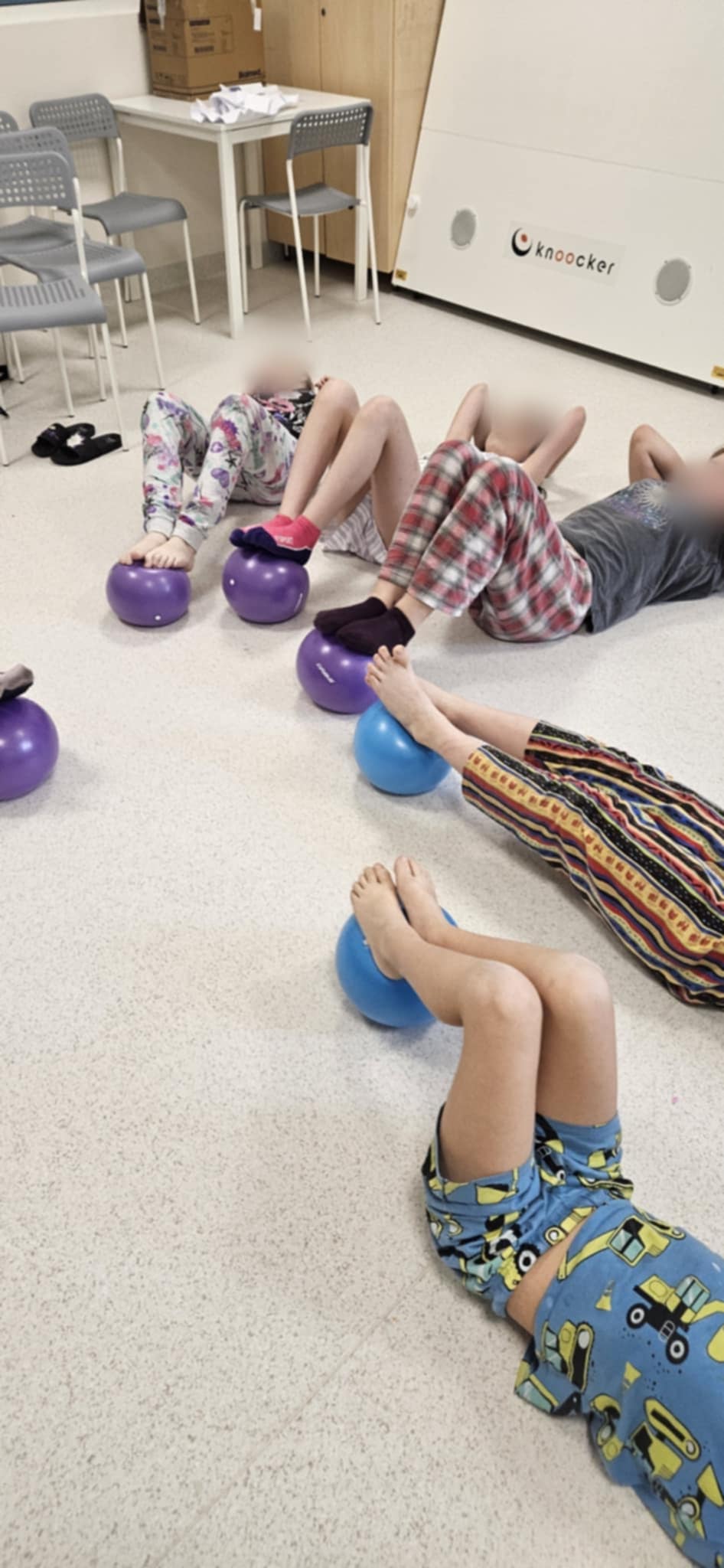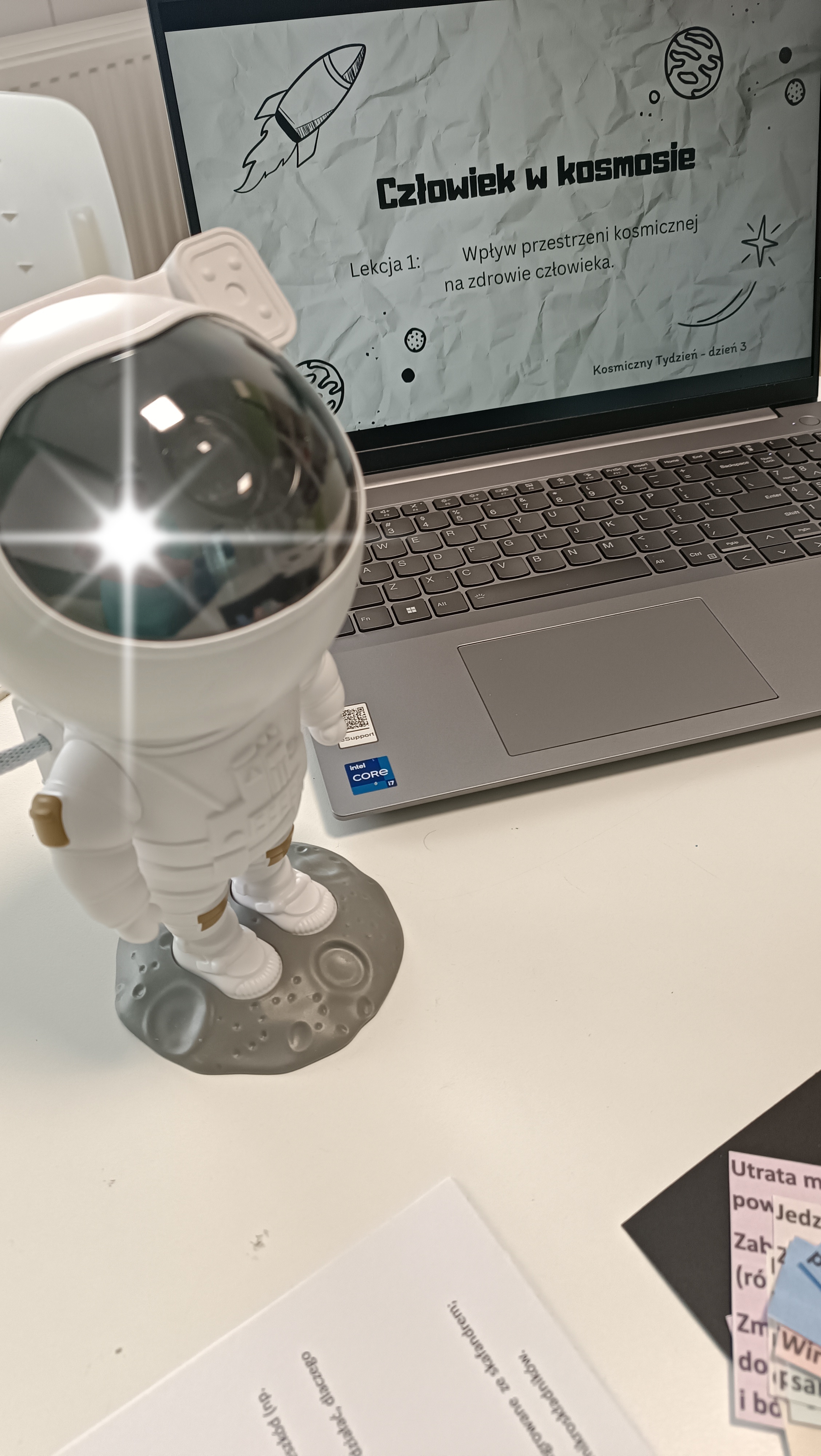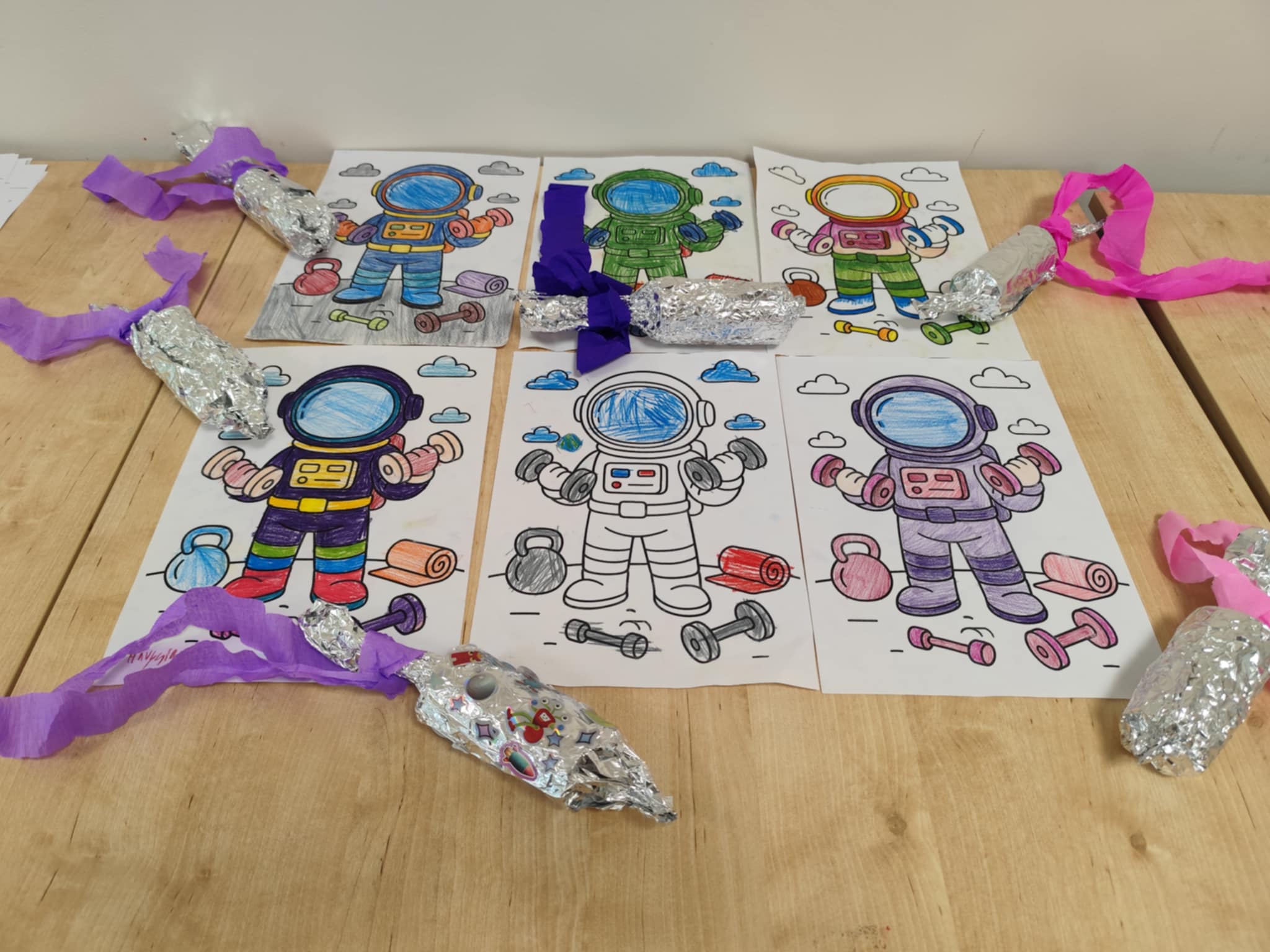 Na zakończenie tygodnia uczniowie wyruszyli w „kosmiczną podróż treningową” inspirowaną ćwiczeniami astronautów. Młodsze dzieci brały udział w zajęciach ruchowych z wykorzystaniem piłek gimnastycznych – wykonywały m.in. rozgrzewkę „start rakiety”, „księżycowy chód” z piłką, „dryfowanie w przestrzeni” oraz pokonywały tor przeszkód. Nie zabrakło relaksacji z wyobrażeniem powrotu kapsuły na Ziemię i poczucia dumy z wykonanej misji. Na koniec dzieci stworzyły własne rakiety oraz kolorowe sylwetki astronautów. Starsi uczniowie również uczestniczyli w ćwiczeniach ruchowych – takich jak cardio, stretching i ćwiczenia siłowe, inspirowane rutynami załogi Międzynarodowej Stacji Kosmicznej.