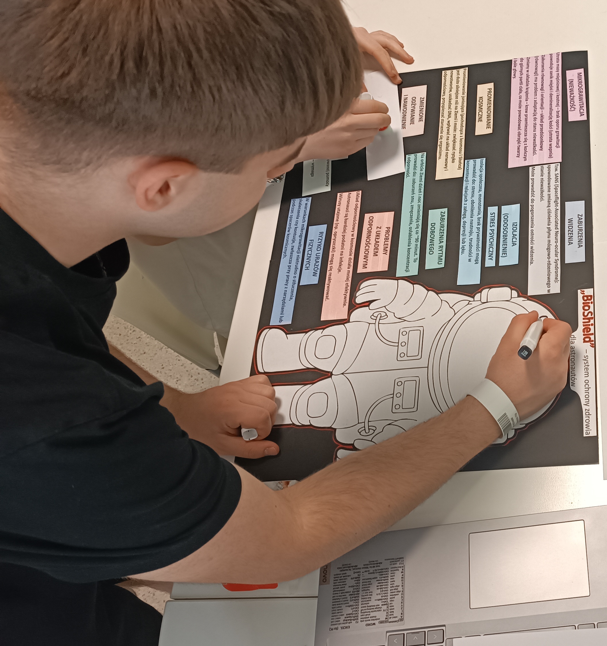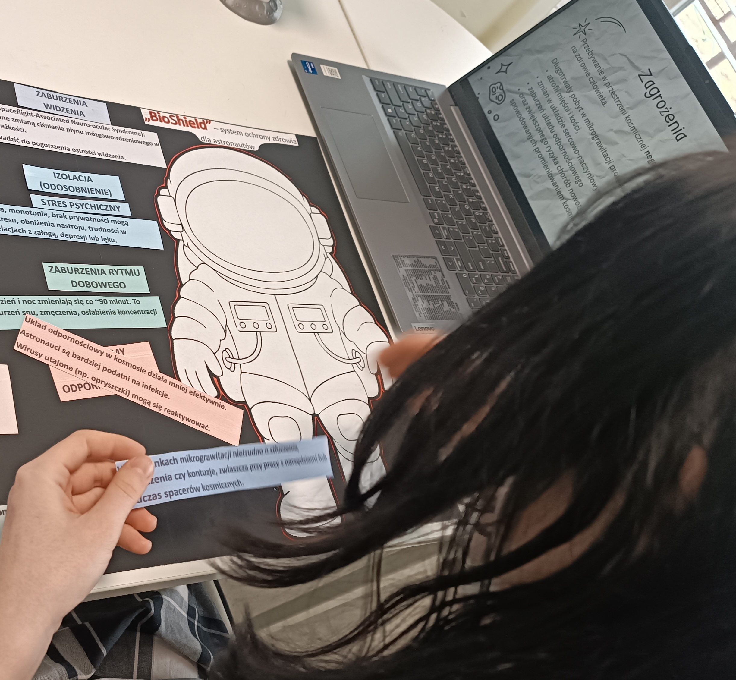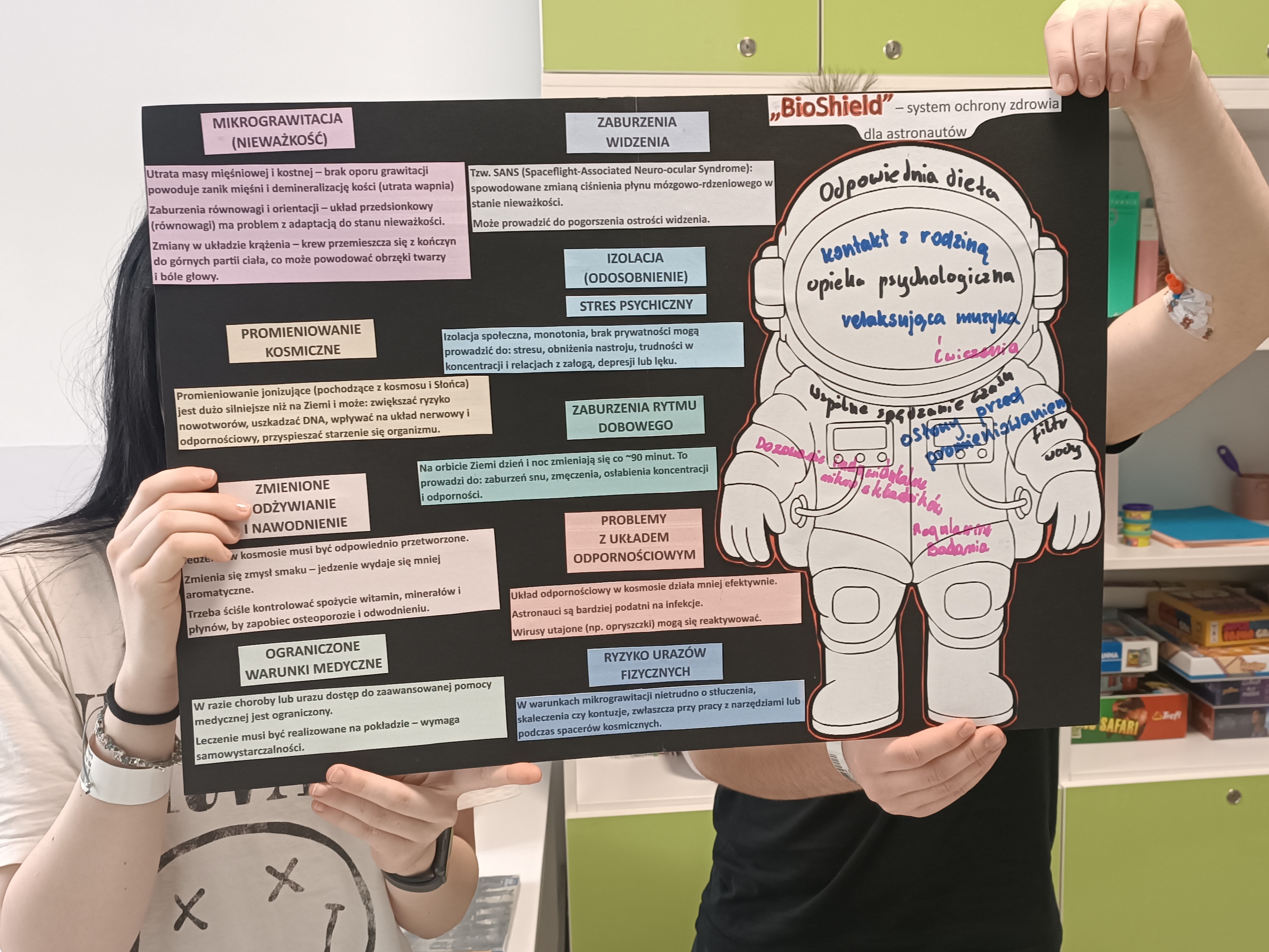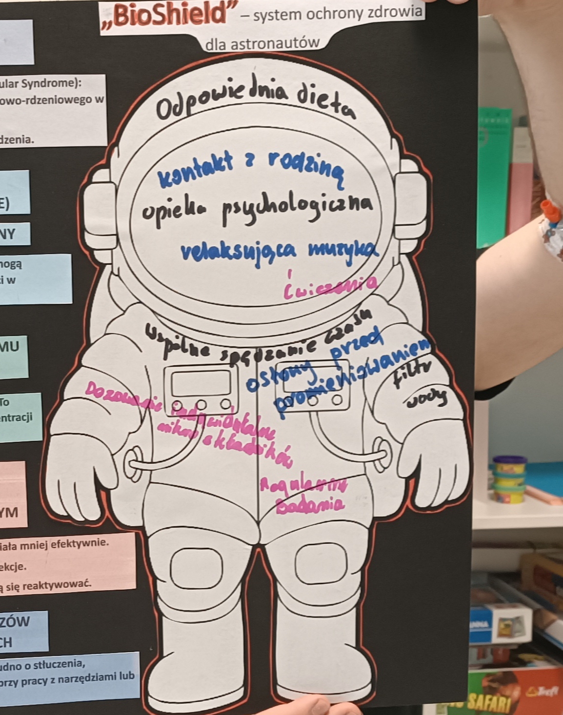 Tego dnia uczniowie dyskutowali o wpływie warunków kosmicznych na zdrowie człowieka – zarówno fizyczne, jak i psychiczne. Zastanawiali się, co dzieje się z ciałem w nieważkości i jak astronauci radzą sobie z izolacją. Wspólnie wykonali plakat „Bioshield”, a młodsze dzieci dały upust wyobraźni, lepiąc z plasteliny oryginalnych kosmitów oraz tworząc własne gry planszowe inspirowane życiem poza Ziemią.
