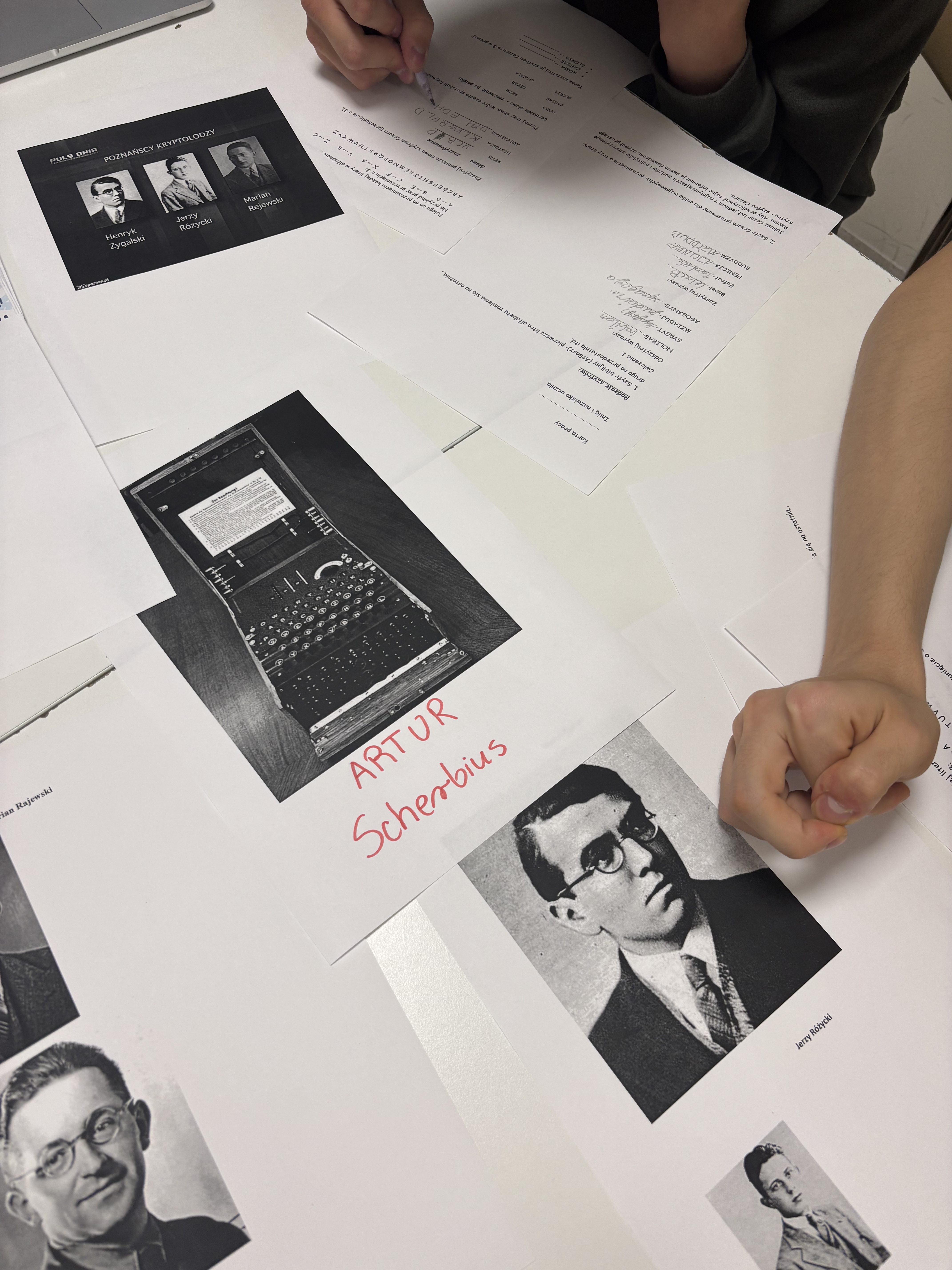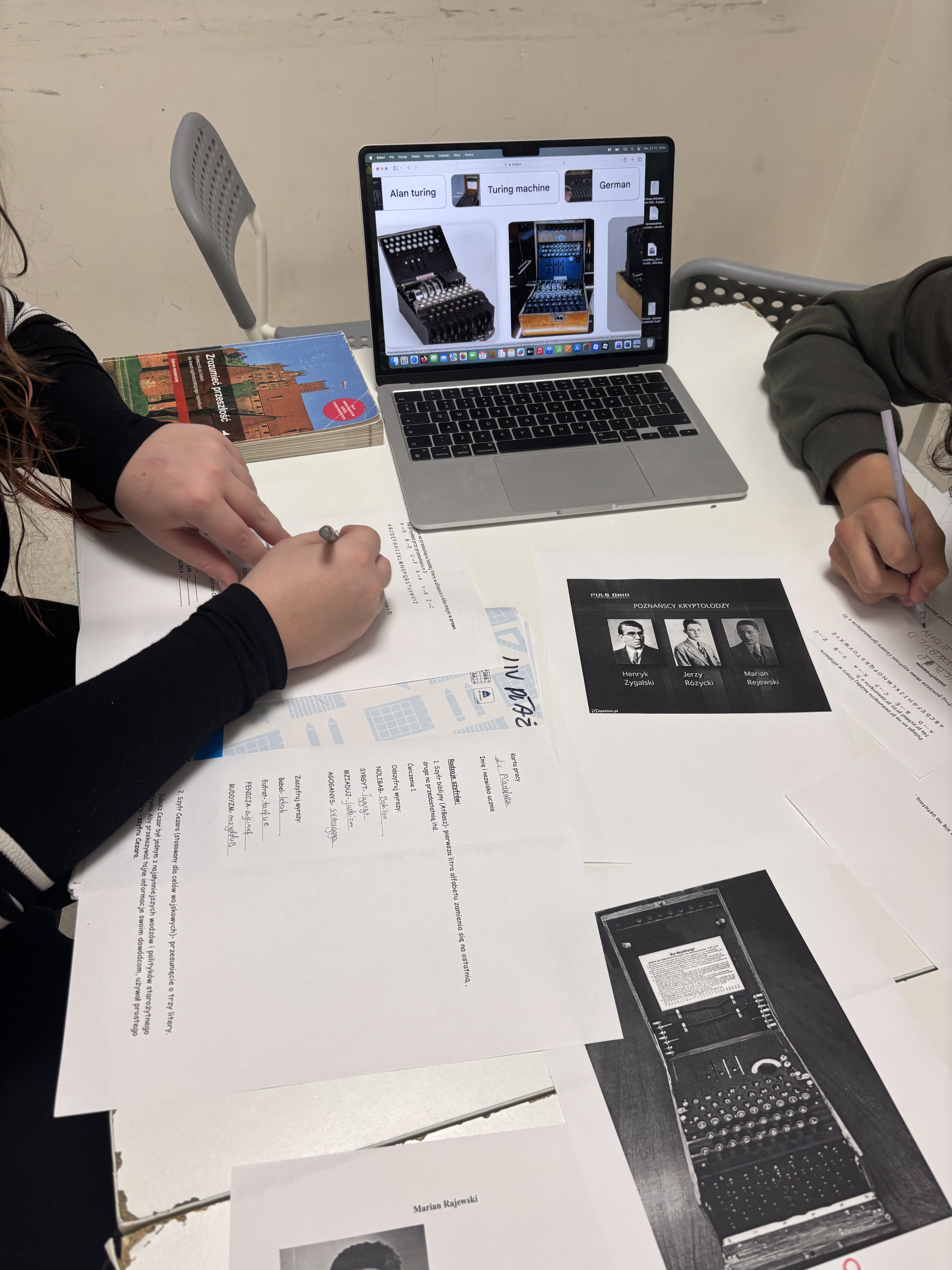 Na lekcjach historii i WOS-u uczniowie poznali tajemnice kryptologii – dowiedzieli się, czym zajmują się łamacze kodów, nauczyli się szyfrować wiadomości szyfrem Cezara i Atbasza, a także odkryli historię Enigmy i jej złamania przez polskich matematyków.