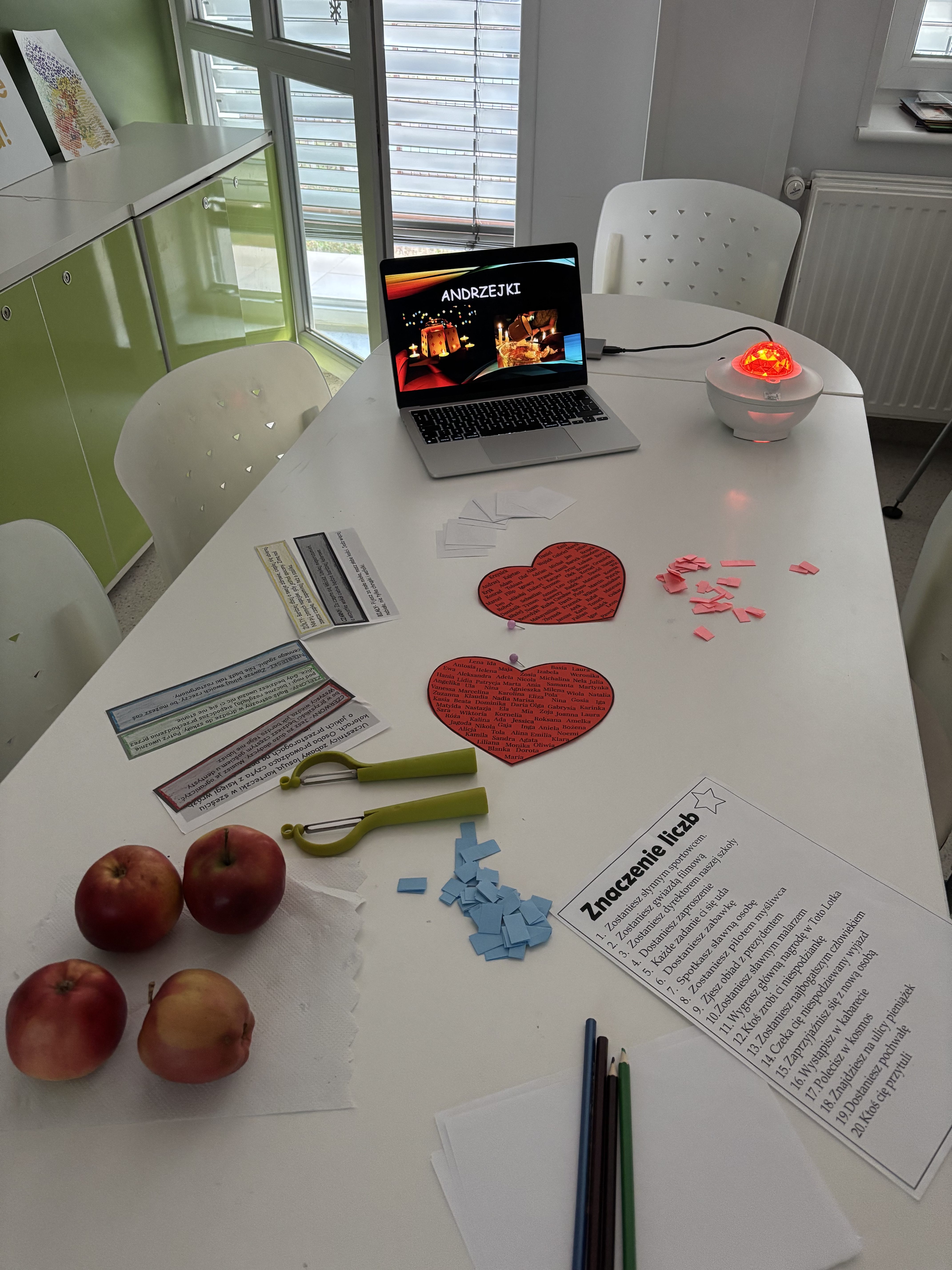Uczniowie rozpoczęli dzień od obejrzenia prezentacji poświęconej genezie i historii tego wyjątkowego święta. Następnie czekało na nich mnóstwo atrakcji — ustawianie butów, przebijanie serc, obieranie jabłek, odkrywanie znaczenia dat urodzenia oraz losowanie przyszłych zawodów.