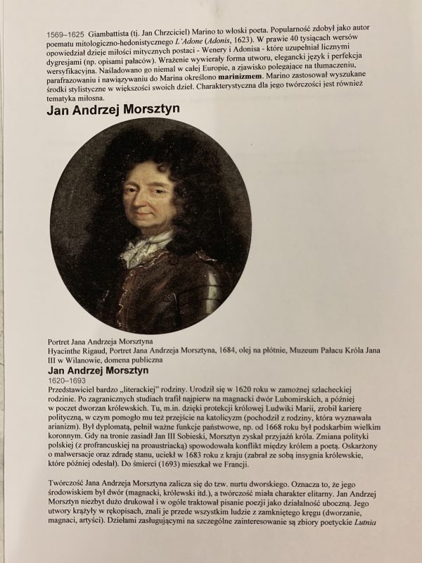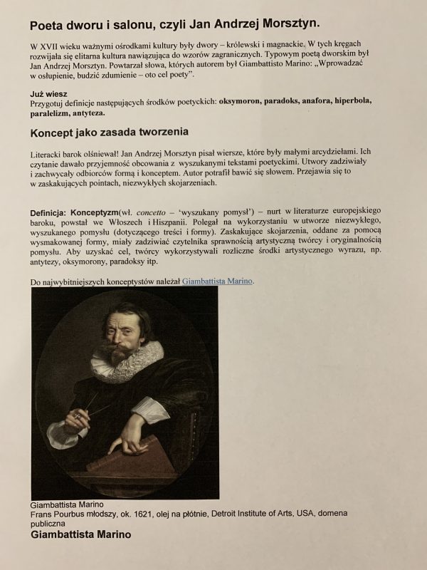 Temat: Poeta dworu i salonu, czyli Jan Andrzej Morsztyn. admin 2020-03-24 Proszę o zapoznanie się z przedstawionymi informacjami i przesłanie odpowiedzi, na maila. Jeśli potrzebujesz pomocy-czekam na wiadomość!
