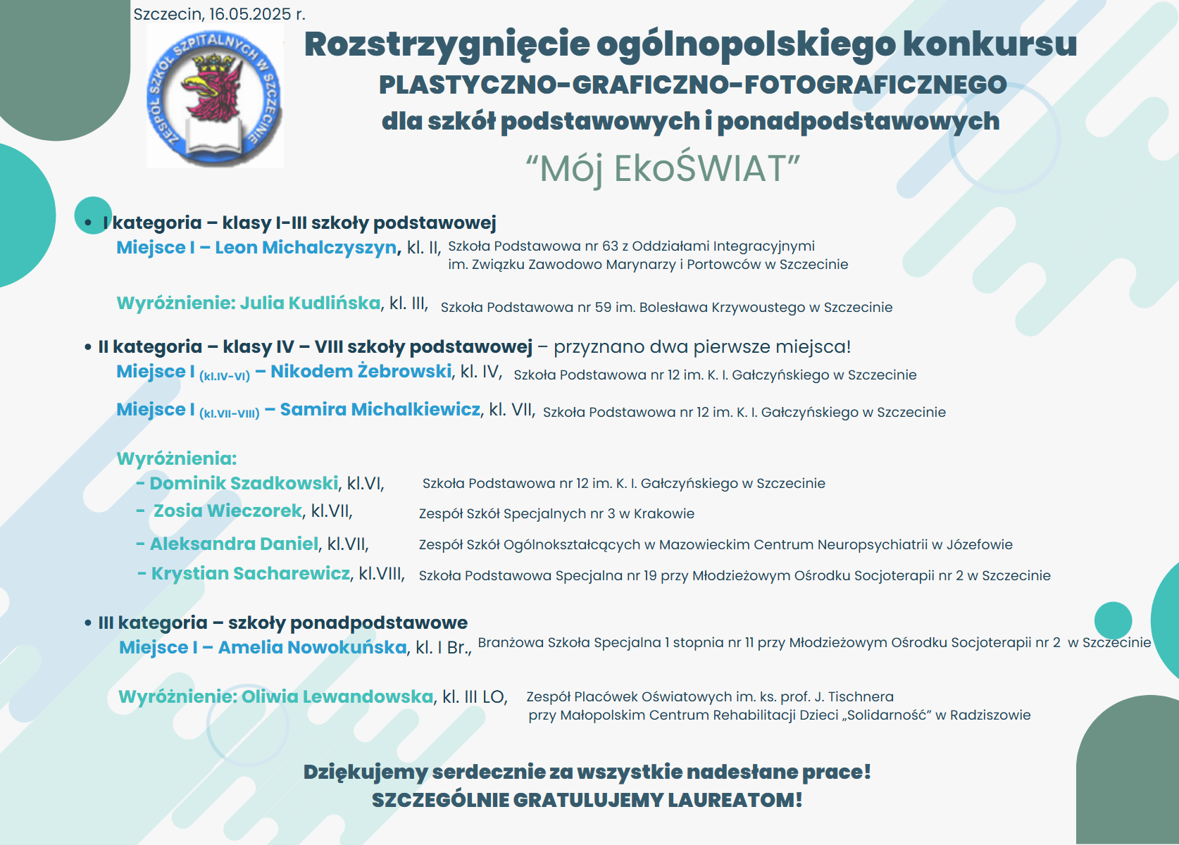 Wyróżnienia: Michał Solohub, kl. 2, Szkoła Podstawowa nr 5, praca „Park Kasprowicza” oraz Pola Klekocka, kl. 2, Katolicka Szkoła Podstawowa im. Jana Pawła II, praca „Filharmonia im. Mieczysława Karłowicza w Szczecinie”.