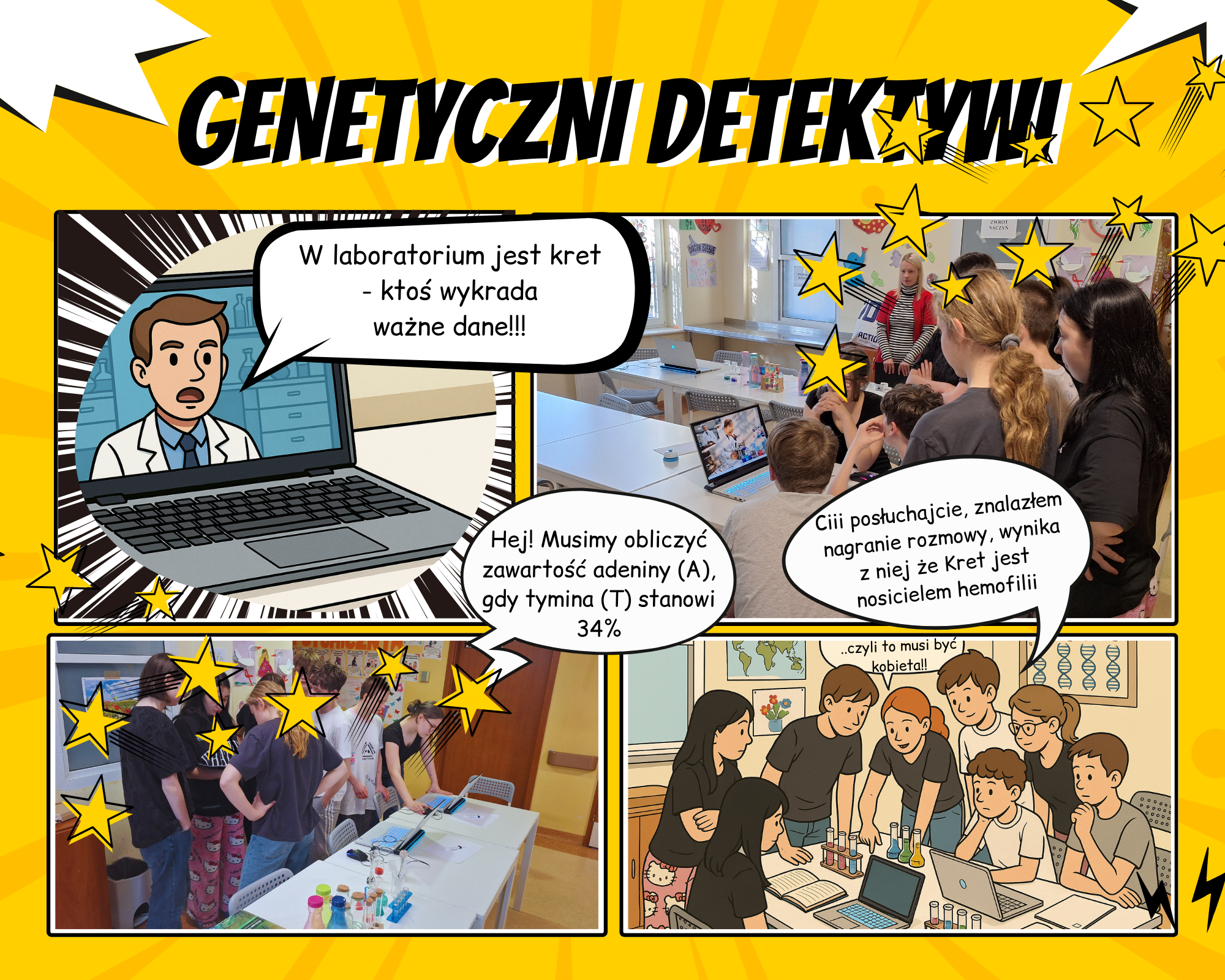 Drugie zajęcia przeniosły uczestników w świat genetyki i dedukcji. Wprowadzający film – stworzony przez sztuczną inteligencję i zmontowany w Movavi – przedstawiał dramatyczną sytuację: w laboratorium działa sabotażysta, tzw. „kret”. Uczniowie jako genetyczni detektywi musieli go odnaleźć, analizując dane i rozwiązując naukowe zagadki.